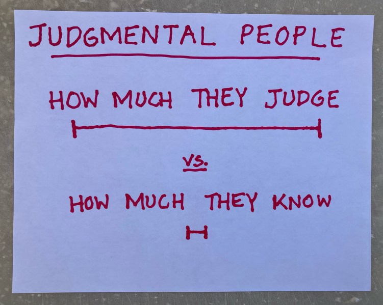 Life is a lot more fun now that I’ve gotten the hang of replacing judgment with curiosity. When I hear Cheryl say “eww” in response to something someone says or does that strikes me as odd (but doesn’t hurt me or anyone else), I generally default to “well, what the hell do I know” and move on. There’s so much I don’t know that I’d like to understand better, and yet so much more that I don’t care to interrogate at all. All of Cheryl’s criticism, negativity, and labeling come from a fear-based need to control. And controlling is so much work! I’ve become a big fan of surrender. If it doesn’t concern me, I can just let it be. What a relief!
